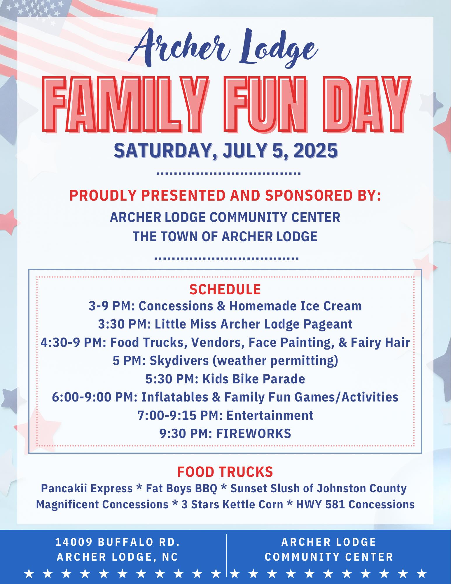 Archer Lodge Community Center 14009 Buffalo Road, Clayton, NC, United StatesJoin us for the annual Archer Lodge Family Fun Day on July 5th, 2025. Schedule of Events 3-9 PM Concessions & Homemade Ice Cream 3:30 PM Little Miss Archer Lodge […]